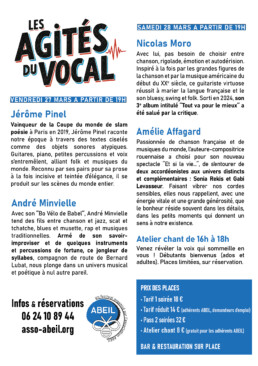 Comme tous les ans, ouverture des portes à 19h00 afin de vous laisser profiter du bar et de la restauration mitonnée par l’équipe des Agités.